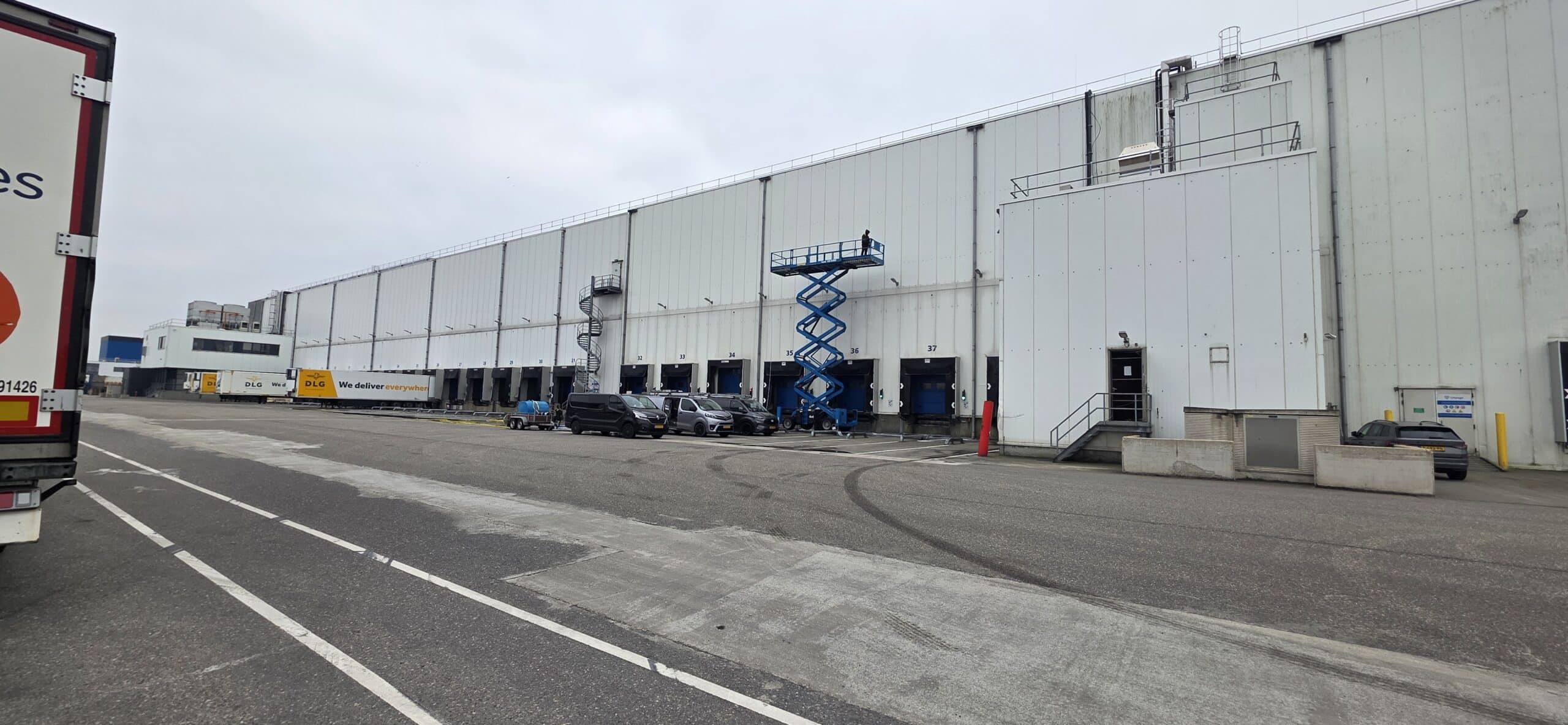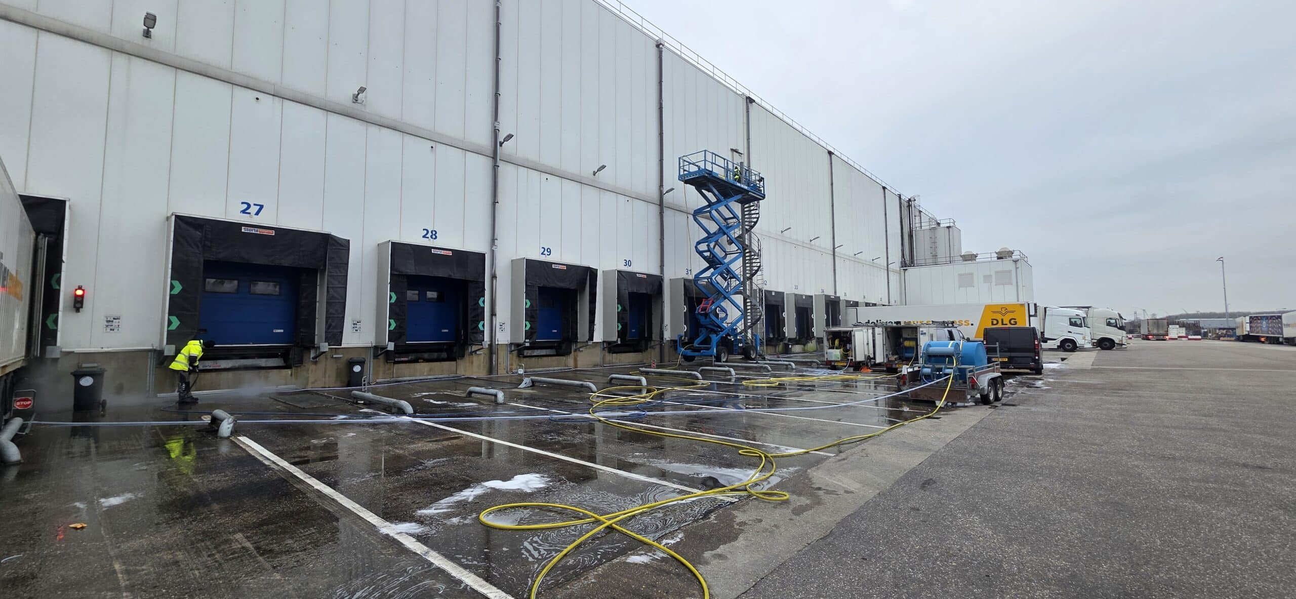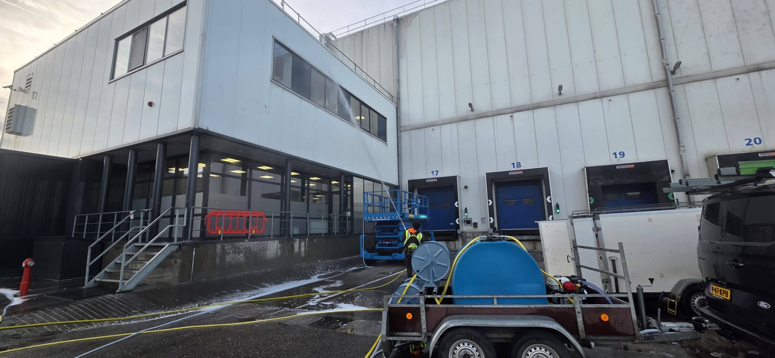Bij een distributiecentrum ligt alles stil zodra je in de weg zit. Vrachtverkeer moet door, docks moeten beschikbaar blijven en elke vertraging kost direct geld. Toch moet het pand onderhouden worden. Dat is precies waar het vaak schuurt. Reinigen betekent in veel gevallen dat delen van het pand tijdelijk niet gebruikt kunnen worden. En dat is hier simpelweg geen optie. Daarom draait het niet om schoonmaken, maar om hoe je het uitvoert. Door het werk strak te plannen en afgestemd uit te voeren, is de volledige voorzijde van het pand binnen drie dagen gereinigd. Zonder dat de operatie ook maar één moment hoefde stil te staan. Het resultaat is een pand dat weer representatief is, terwijl alles gewoon door blijft draaien!